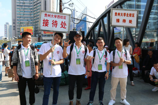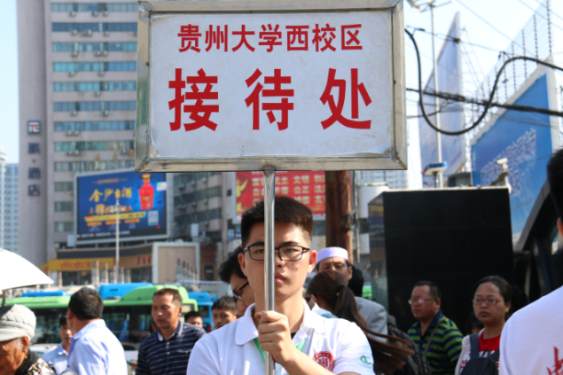 接站的同学高举着贵州大学的牌子,尽量让自己人流