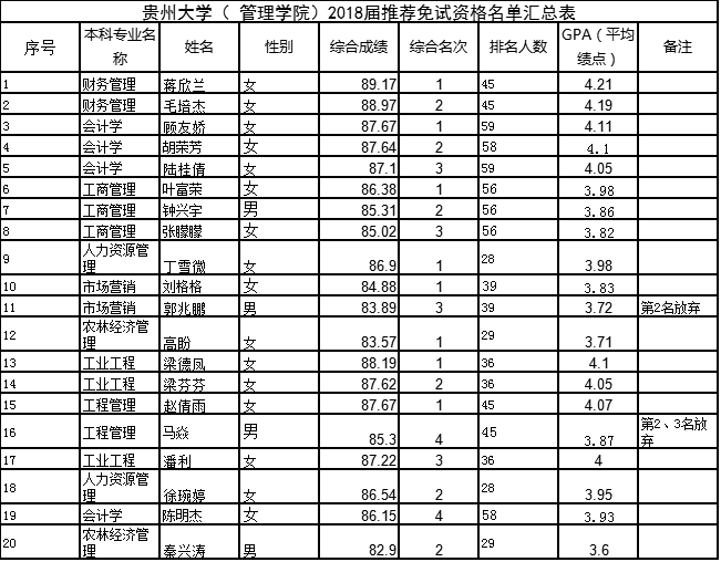 根据《教育部关于印发〈2018年全国硕士研究生招生工作管理规定〉的通知》(教学〔2017〕9号)、《教育部办公厅关于做好2018年推荐优秀应届本科毕业生免试攻读研究生工作的通知》(教学厅〔2017〕13号)精神,并按照《贵州大学关于推荐2018届优秀应届本科毕业生免试攻读硕士学位研究生的通知》(贵大发〔2017〕127号),及《管理学院推荐2018届优秀应届本科毕业生免试攻读硕士学位研究生工作实施细则》,经各班推荐,学院推免生工作领导小组审核评选,同意推荐蒋欣兰等20位同学获得推免生资格(名单见附件),现予以公示。