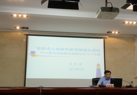 王礼全研究员以“坚持走山地特色新型城镇化道路——关于贵州城镇化的几个问题”为主题,从“我们需要什么样的城镇”为切入点,向我们介绍了城镇的起源。以贵州的城镇化发展的悠久历史、深刻认识城镇化的重要作用、贵州城镇化进程中面临的问题和加快推进城镇化的对策思考四大板块,向师生全面和系统的介绍了贵州的山地特色新型城镇化建设。在肯定城镇化建设中的巨大变化的同时,也提出了一些存在的问题和解决的对策。他认为在随着贵州加快推进城镇化进程的同时也面临着以下几个主要问题:一是产业支撑力不足;二是基础设施不配套;三是发展不平衡;开放度不高;四是城镇内在联系不紧密;五是规划建设管理水平不高。如何克服现今贵州城镇化中存在的问题,王礼全研究员以自己深厚的渊博的知识、有理有据的论证,认为应当加快城镇体系构建,并提出了“一核、一群、两圈、六组、多点”的省域城镇体系,着力推进转型发展,进一步提升产业支撑能力,进一步加强城镇基础设施建设,加快美丽乡村建设统筹城乡发展等的一系列对策。谦逊的学者作风以及对贵州省情的全方面深层次的独到见解,让在场师生不禁称赞,赢得现场师生的阵阵掌声。