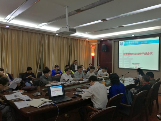 陶书记首先向与会人员公布了《中共乐动官方网站委员会乐动官方网站关于调整院领导成员分工的通知》、《中共乐动官方网站委员会乐动官方网站2017年工作要点》,并要求各位中层干部根据学院领导分工及2017年的工作要点,结合自身工作实际,计划和安排好今年的各项工作。之后,院长李烨向与会人员公布了《管理学院工作简报2017年1-3月》,并希望与会干部能根据每月工作情况,及时提供工作总结,作为学院简报的基础素材。
