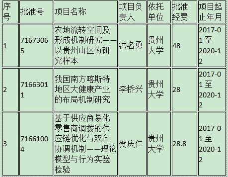 根据国家自然科学基金委员会《关于公布2016年度国家自然科学基金申请项目评审结果的通告》,我院洪名勇、李桥兴、贺庆仁三位老师喜获国家自然科学基金项目,资助经费累计104.8万元,这是我院近年来获得国家自然科学基金项目最多的一年。与2015年相比,我院新增自科基金项目立项数2项,增长200%,资助经费增加74.8万元,增长248.3%。名单具体见表1: