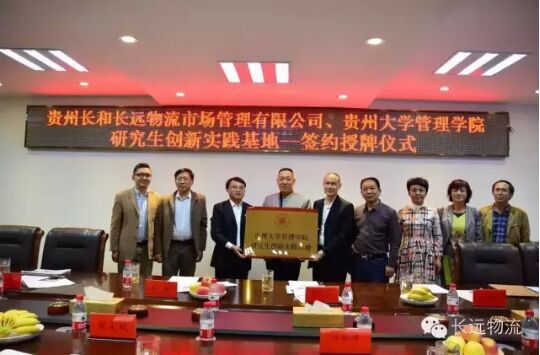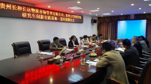 为增强企业管理创新能力和核心竞争力,提高学校科研实力、充实学科建设内涵、创造更为良好的育人环境,2015年11月6日,我院研究生创新实践基地和本科教学实习基地签约及授牌仪式在贵州长和长远物流市场管理有限公司举行。长远物流市场管理有限公司总裁宋文斌、执行总裁沙松涛、副总裁聂淼、我院李烨院长、周莉莉副院长等十余人出席了签约及授牌仪式。