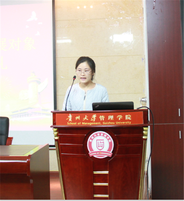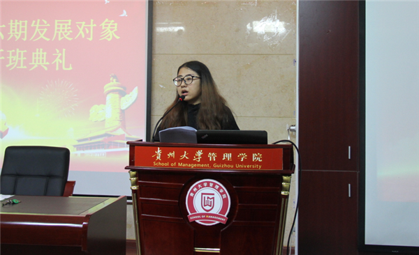 然后是学员代表2015级财务管理专业敖蓉洁同学进行发言,她就身为一名党员发展对象该如何做及该怎样去做与大家分享了自己的切身感受及未来的发展目标,希望大家共同勉励共同学习,以党员标准严格要求自己,争取早日成为党的一员。