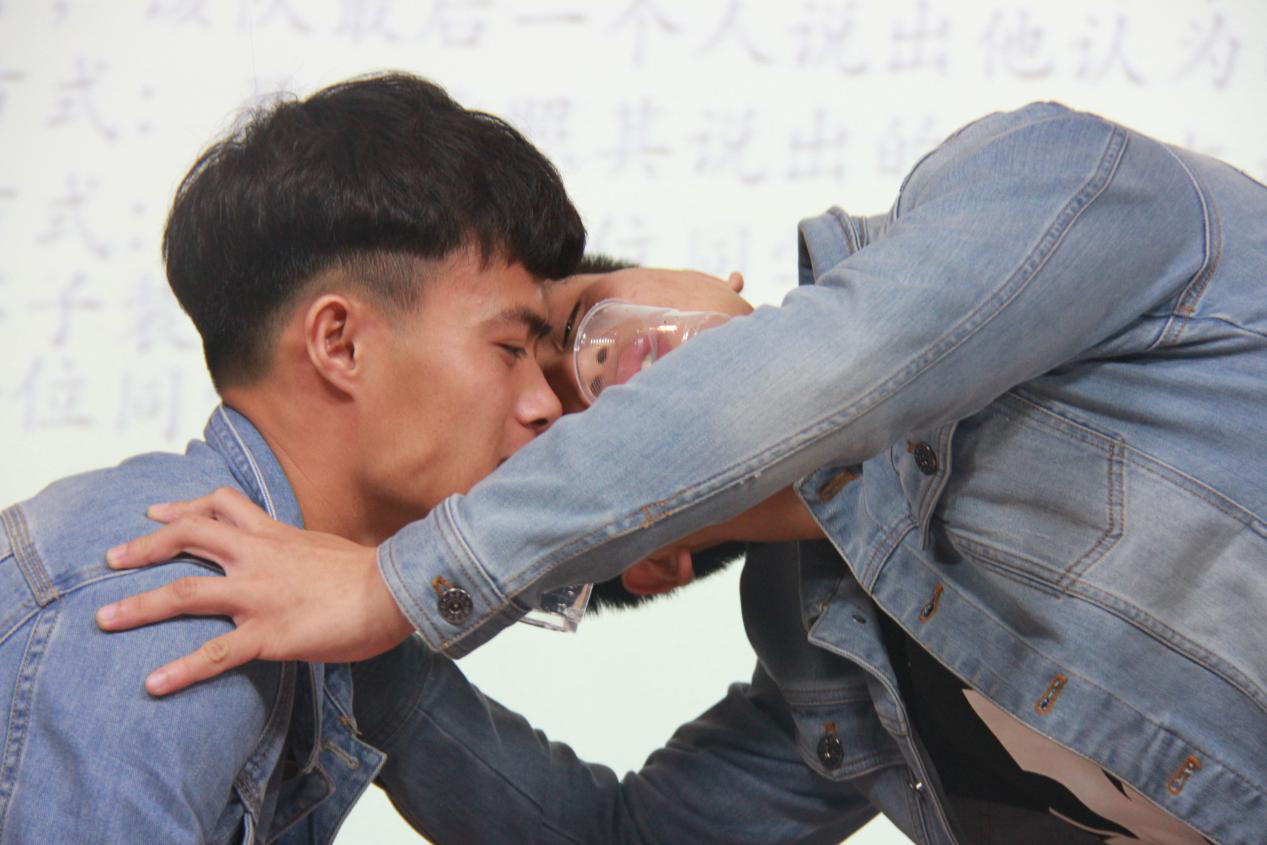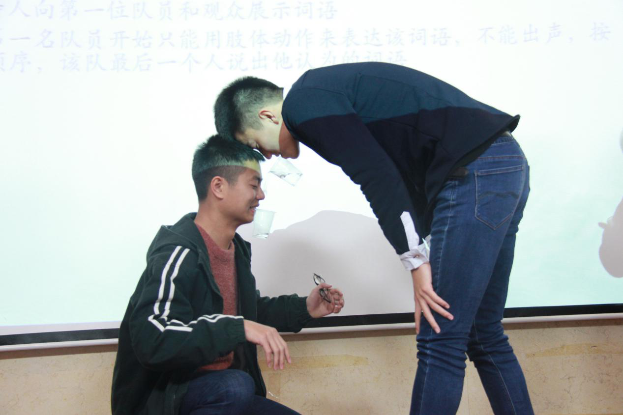 第二个游戏名为:传音筒,活动参与人数:每组出五位同学参加,由小组自行推出,第一小组游戏时第二小组准备。活动内容如下:分类准备难度不一的词语,每一类大约15个(例如:生活类,科技类),每组成员上台后站成一列,除第一位队员外,剩余4人都背对主持人开始游戏,同时下一组准备,所传达词语由主持人随机抽取,主持人向第一位队员和观众展示词语,从第一名队员开始只能用肢体动作来表达该词语,不能出声,按此顺序,该队最后一个人说出他认为的词语。最后按照其说出的词语与标准答案的相符度计分,该游戏的惩罚方式为:传水,每位同学叼一个一次性杯子,在第一名同学一次性杯子装四分之三水,第一名同学将杯子水倒给第二名往后传,最后一位同学杯子水不得少于四分之一,太少则重新开始。在该游戏的惩罚环节,有效地提高了大家的默契程度,台下的观众纷纷举起手机进行拍照,十分开心。游戏过后为缓解大家的疲惫,艺术团的同学为大家带来了一首独唱《过火》,将现场气氛又推入另一个高潮。