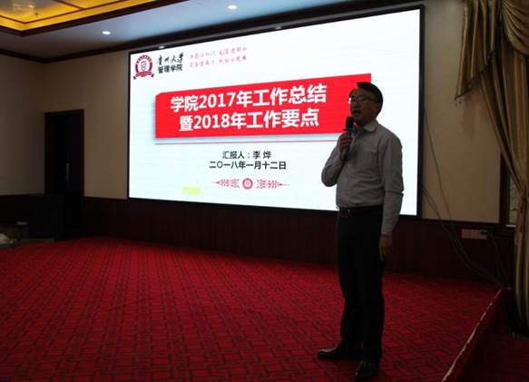 在主持人向大会介绍参会人员之后,李烨院长代表学院党政领导班子向大会做题为《学院2017年工作总结暨2018年工作要点》的报告。李院长表示2017年贵州大学各项事业发展取得新的突破与成就,特别是双一流高校建设和部省共建高校建设,为贵州大学赢得了极大的社会声誉,党的十九大的胜利召开,为贵州大学的发展提供了更为广阔的平台和机遇。学校各项事业的节节高升与全面开花,为管理学院的发展提供了更高水平的平台、更加难得的机遇。在新的机遇和挑战面前,管理学院上下,心往一处想,劲往一处使,2017年学院各项事业取得长足发展,在学校2017年度加快发展目标绩效考核中取得4A1B等次、年度基层党建工作考核中取得优秀等次,此外学院2017年重大成就有三项,分别为:一是农林经济管理、管理科学与工程一级学科进入国内一流学科建设行列,并成功申报农林经济管理、管理科学与工程一级学科博士点;二是成功申报贵州大学波罗的海区域研究中心(教育部国别与区域研究中心),并举行贵州大学波罗的海区域研究中心揭牌仪式暨一带一路跨国知识青年创新创业高峰论坛;三是成立贵州大学校友会管理学院分会,并成功举办学院校友分会成立大会暨首届校友企业家创新创业论坛。