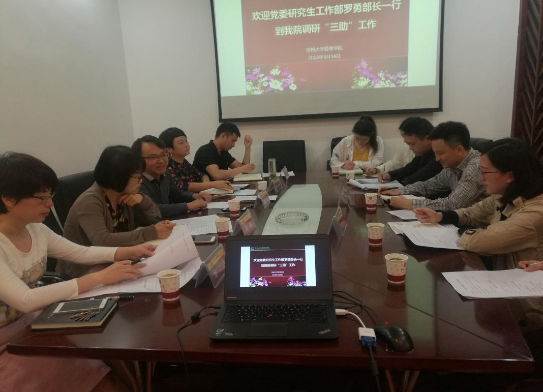 李烨院长对学院研究生“三助”工作开展情况作总结发言,他首先代表学院对学校各部门长期对管理学院工作的关心、帮助和支持表示感谢,学院近年来研究生办学规模逐步扩大,研究生教育教学质量稳步提升,学院也将继续加强研究生“三助”工作的指导与管理,切实让广大学生在不同的岗位上得到自我的锻炼与提升。罗勇部长深入了解了学院情况后,对领导班子的负责、管理学院三助工作表示认可,并针对工作问题商讨相应的解决方案,将解决问题落到实处。