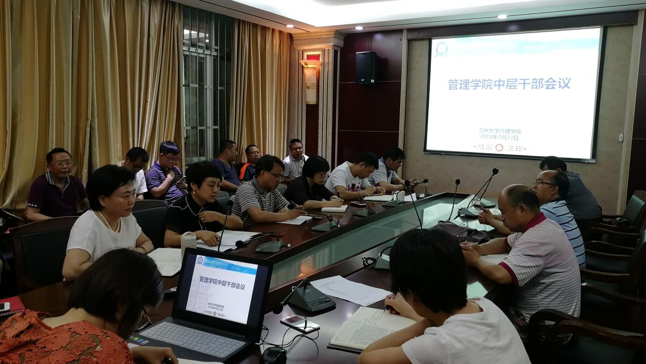 2018年5月22日下午13:30,管理学院在致远楼一楼案例室1召开学院中层干部会议。学院领导、党政办公室成员、学院各科室负责人、各系主任及各党支部书记参加会议,会议由学院院长李烨教授主持。