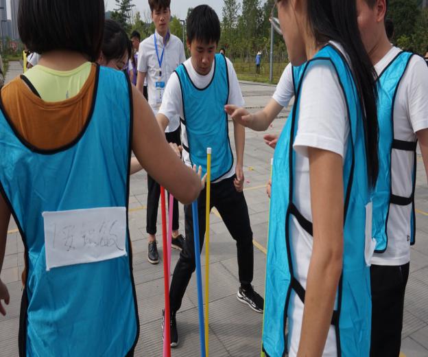 团队成员围成圆圈站立,左手放在背后,右手手掌置于杆顶端,喊“换”同时换杆并保证杆不倒下,连续累计换3圈,用时最少的团队获胜。