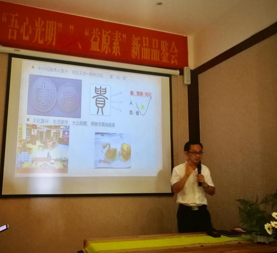 大益集团西南市场部总经理罗荣向大家介绍了吾心光明,“吾心光明是一款生茶,这款茶其实它是大益体系的人文茶,它是为了纪念我们的先贤王阳明先生而推出的;益原素是一款比较典型的、一款创新的,它是第三代发酵技术的一款熟茶。”
