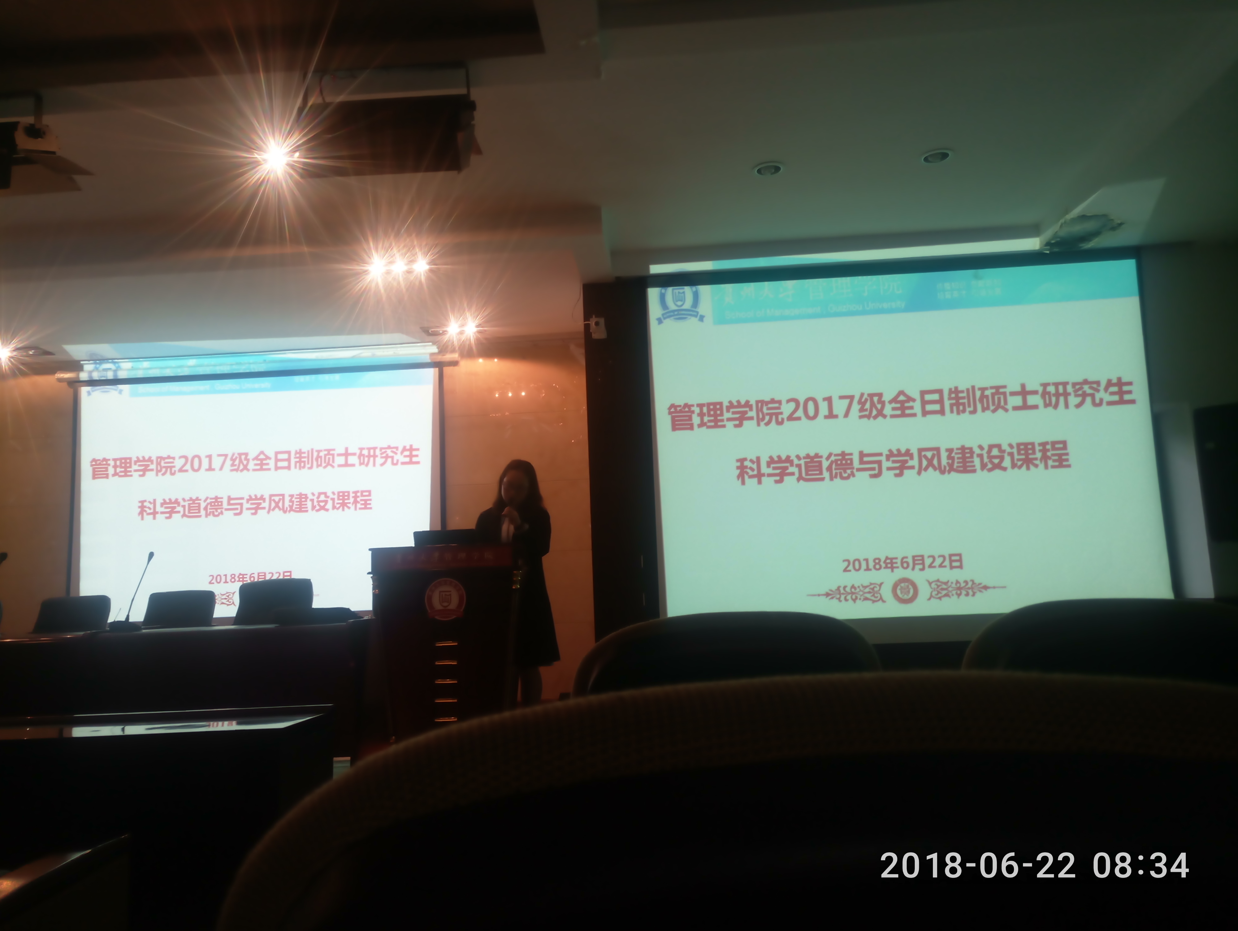 2018年6月22日8:30在管理学院三楼报告厅,管理学院2017级全日制研究生(学术型、专业型)开展学习科学道德与学风建设的课程。此课程由管理学院辅导员邵美婷老师主持,本次课程结束后需要进行小组讨论。
