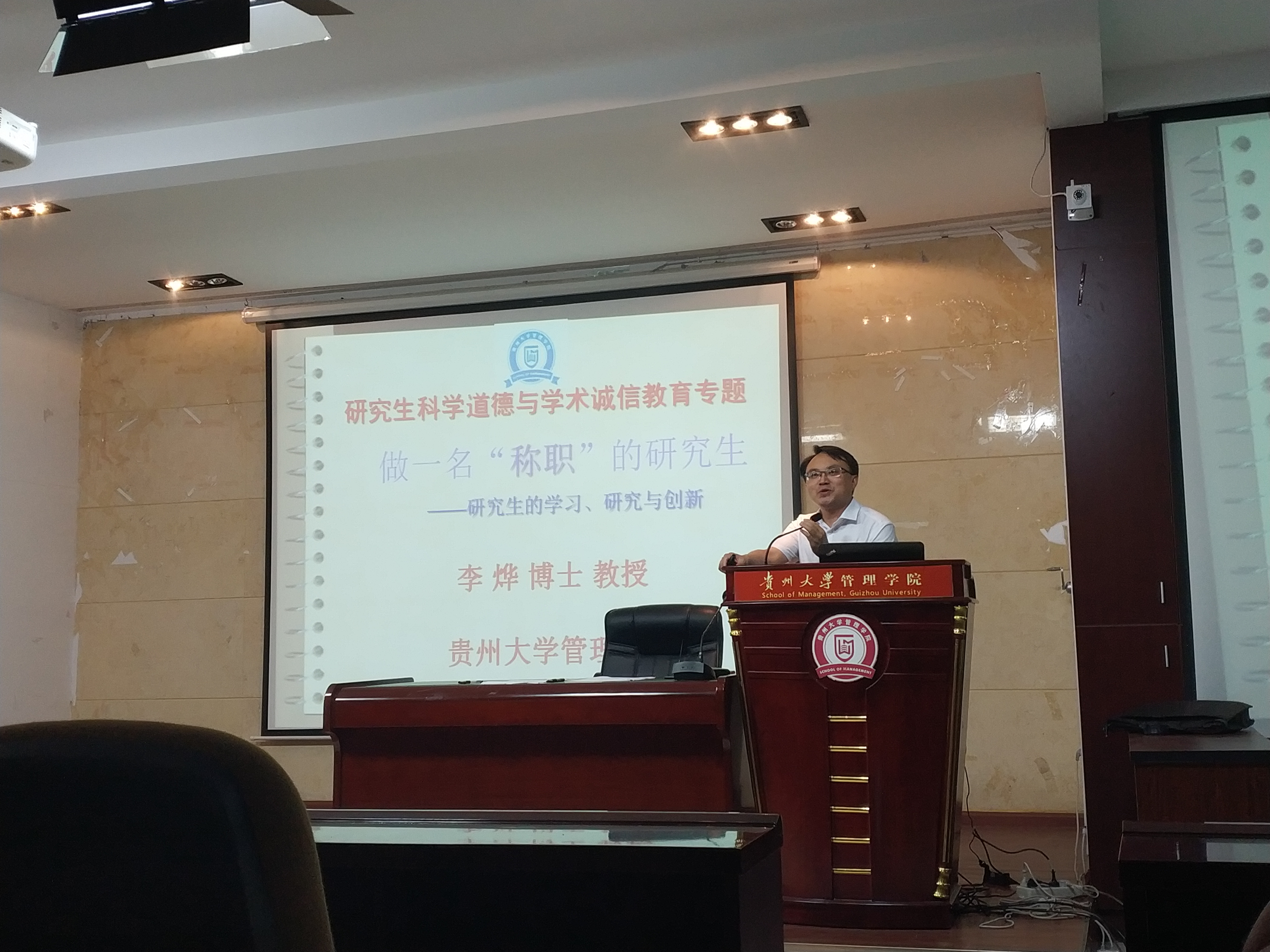 2018年7月4日19:00,在管理学院三楼报告厅,管理学院2017级全日制研究生(学术型、专业型)开展学习科学道德与学风建设第三次课程。此课程由管理学院院长李烨教授主讲。李教授以“做一名“称职”的研究生——研究生的学习、研究与创新”开展本次课程。