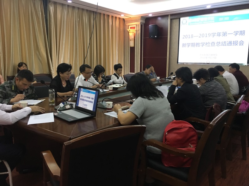 宋山梅副院长通报了一周来教学检查结果,总的来看,开学第一周学院教学秩序稳定有序, 教师到课率100%,学生到课情况整体较好,机房设备准备完好,各门课程正常开出,教材正常到位;宋院长