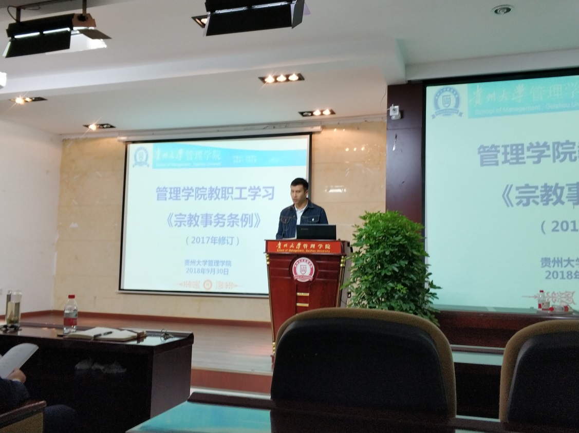 会议开始,李院长传达了《中共贵州大学委员会办公室关于组织学习<宗教事务条例>(2017年修订)的通知》文件精神,并指出政治学习的重要性,要求全院教职员工高度重视,认真对待。随后,学院分管领导就所分管的工作向参会人员进行通报和传达。