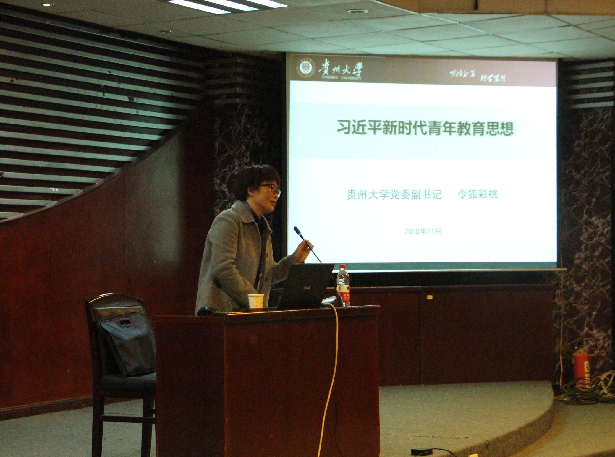 11月25日晚19:00,校党委令狐彩桃副书记受邀为管理学院与法学院第二十九期入党积极分子授课,令狐书记以《习近平新时代青年教育思想》为主题,在慎思楼的模拟法庭为管理学院和法学院第29期入党积极分子培训班的讲授本期学员的最后一堂课。