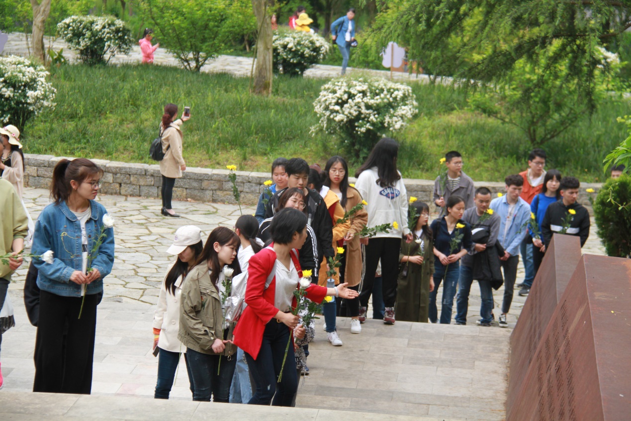 在了解戴将军的辉煌事迹后,老师和同学们排成整齐的队伍,手执鲜花,向伟大的戴安澜将军致以崇高的敬意和深切的缅怀。全体师生集体鞠躬献花。紧接着,在场师生全体默哀三分钟,悼念戴安澜将军。悼念完毕,由龙宪婷主持带领大家唱团歌,重温入团誓词,以此来缅怀抗战先烈。随后,由工商171班的杨涛同学代表发言,在他的发言中,不仅体现了对为保卫祖国献身的英烈们的深切缅怀,更激励了新一代的我们要不忘历史,砥砺前行。