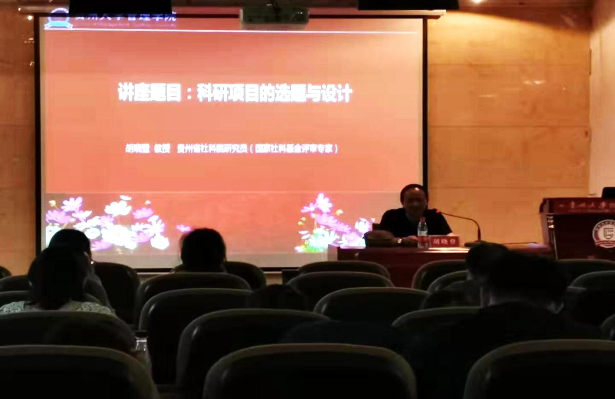 应我校管理学院邀请,贵州省社会科学院经济学二级研究员胡晓登教授于2019年7月30日下午13:00在管理学院三楼报告厅做了题为“科研项目的选题与设计”的讲座。讲座由管理学院李烨院长主持,全体教职工以及2017级和2018级全体研究生同学聆听。