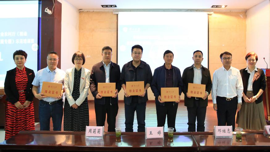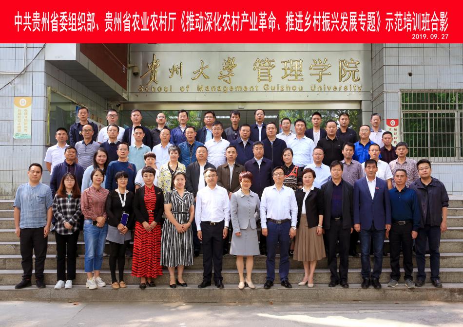 2019年9月27日,中共贵州省委组织部、贵州省农业农村厅《推动深化农村产业革命、推进乡村振兴发展专题》示范培训班结业典礼在管理学院报告厅举行,贵州省农业农村厅副厅长级干部邓继志,贵州大学党委副书记令狐彩桃,管理学院院长李烨,副院长王婷,副院长周莉莉,副院长宋山梅出席了结业典礼。