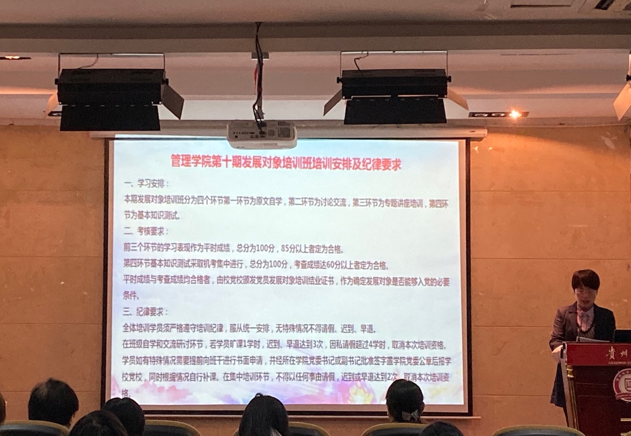 学院专职组组员、学生科科长徐兰老师宣读第十期发展对象培训班纪律要求以及评优要求,强调无特殊情况不得缺勤,迟到或早退达两次以上或培训时玩手机或睡觉达三次,取消培训资格。要求自学阶段笔记不得少于三十页,集中培训阶段笔记不得少于十页等相关要求,同时向同学们介绍了发展对象结业的考试方法及通过要求。