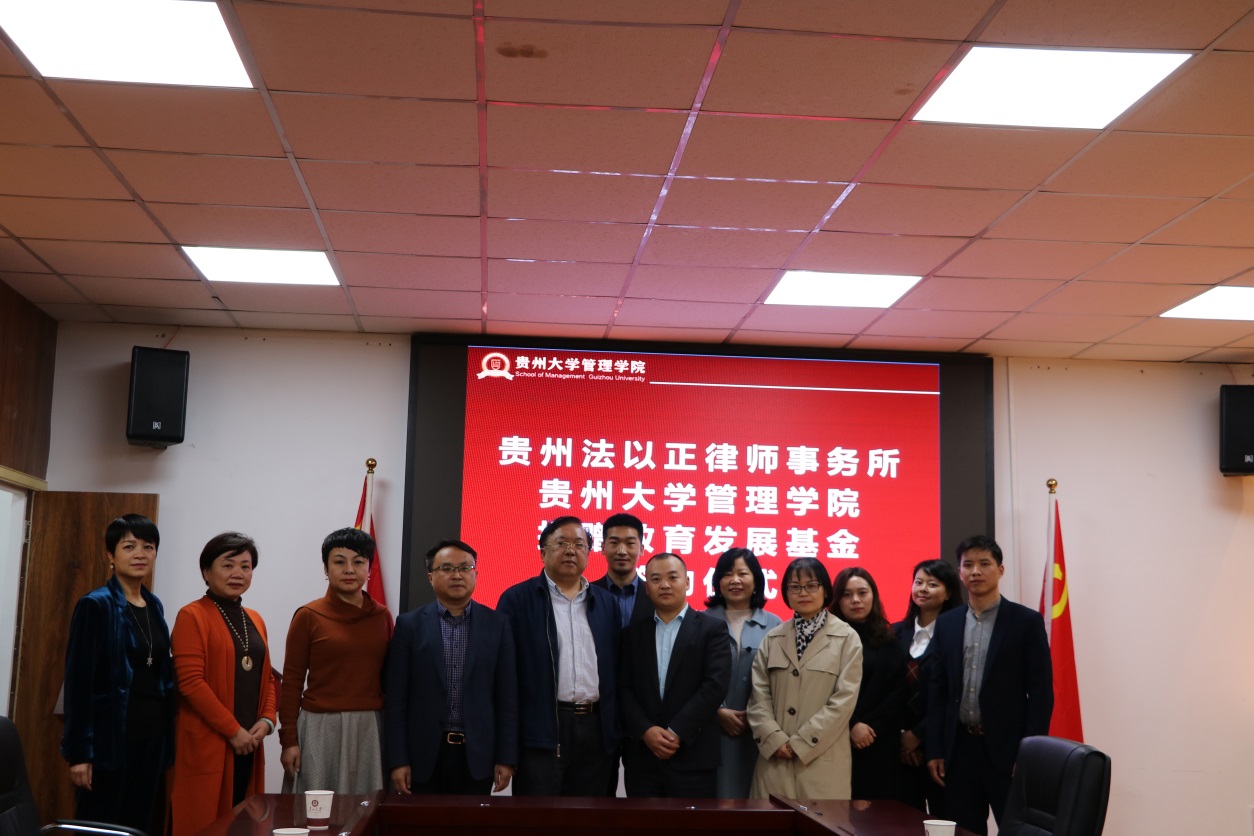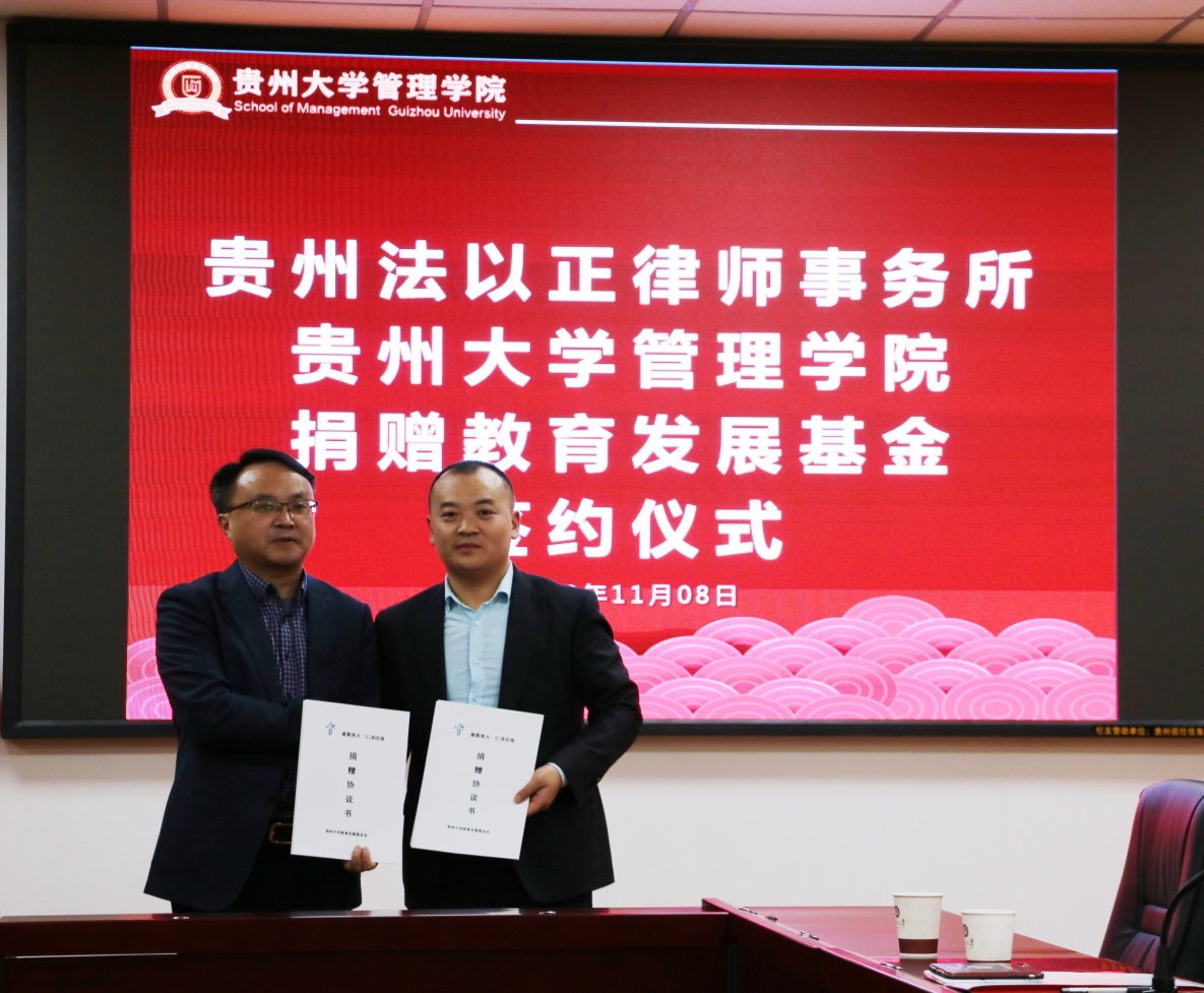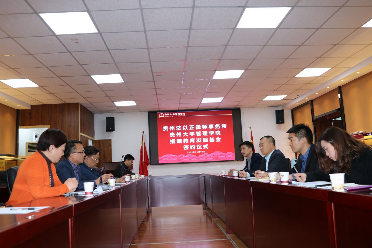 为促进贵州高等教育事业的发展,彰显贵州法以正律师事务所在贵州教育发展过程中的积极社会影响力,鼓励和资助乐动官方网站的优秀贫困学生踏实求学,促进管理学院专业人才成长和成才,2019年11月8日,贵州法以正律师事务所向乐动官方网站捐赠教育发展基金签约仪式在乐动官方网站举行。参加仪式的有:乐动官方网站党委书记王秀峰、院长李烨、副院长周莉莉、副院长王婷、副院长宋山梅、院办公室主任陈建、对外合作办公室主任王云、贵州法以正律师事务所主任张毅、行政总监毛丽萍、金融合规部负责人周奇炎等,仪式由副院长宋山梅主持。