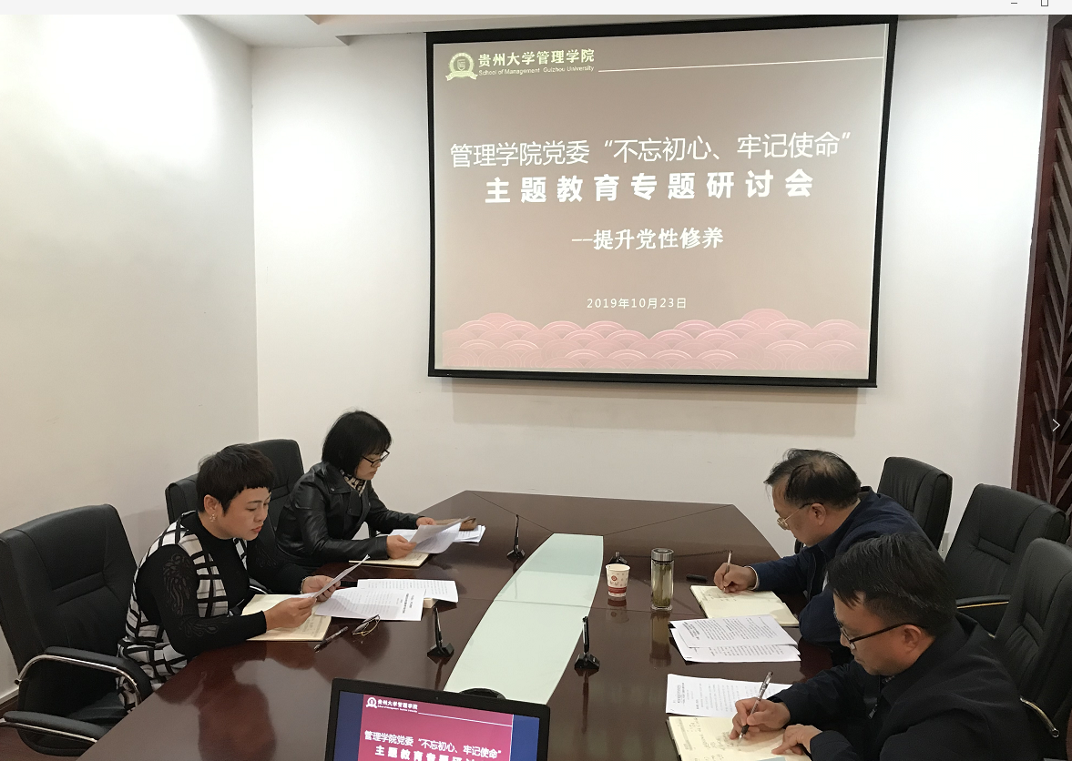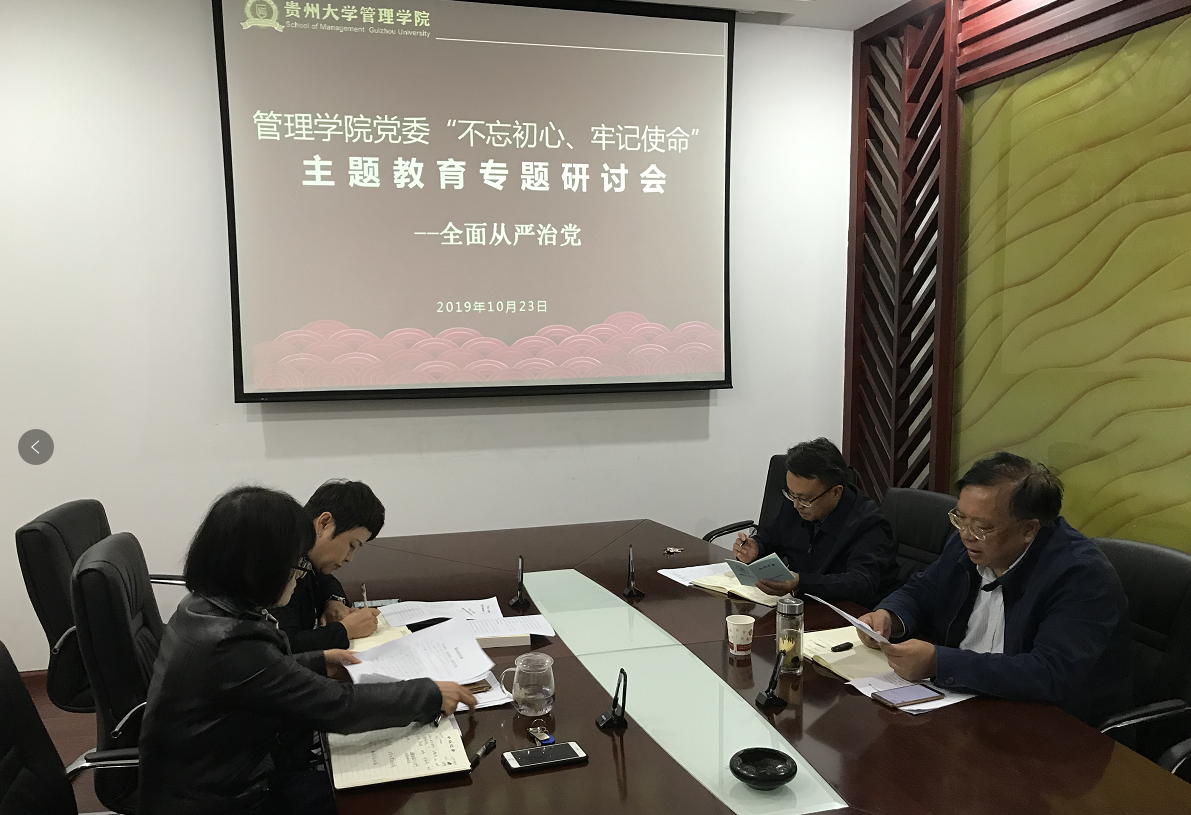 2019年10月23日下午17:00,管理学院党委在致远楼三楼小会议室召开主题教育专题研讨第三次会议。学院党委领导班子成员参加会议,会议由学院院长李烨主持。