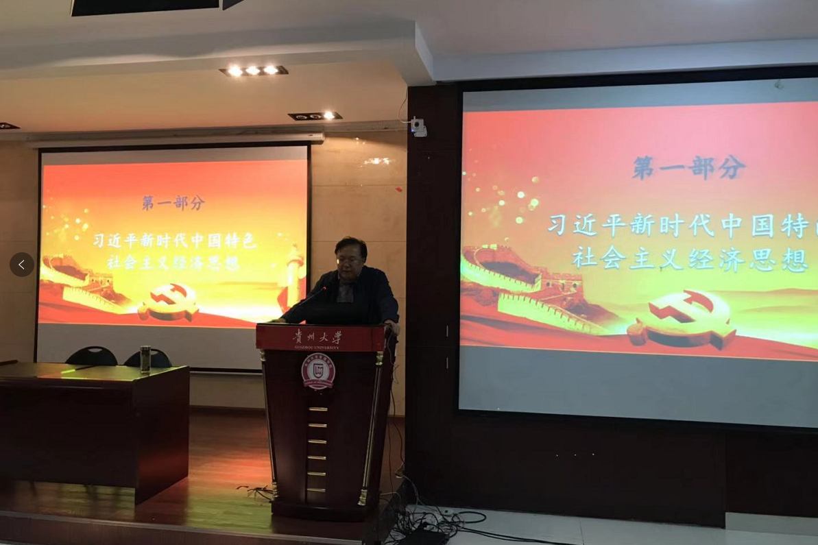 王秀峰的报告分为两大部分,第一部分习近平新时代中国特色社会主义经济思想,重点从经济思想实践基础和理论渊源、习近平经济思想的丰富内涵以及习近平经济思想引领贵州高质量发展三个方面进行阐述。强调习近平新时代中国特色社会主义经济思想,是五年来推动我国经济发展实践的理论结晶,是中国特色社会主义政治经济学的最新成果,是党和国家十分宝贵的精神财富,必须长期坚持、不断丰富发展。第二部分党建、扶贫调研与整改,结合基层党建和扶贫工作问题,按照内容进行归纳和梳理,提出整改措施与对策建议。