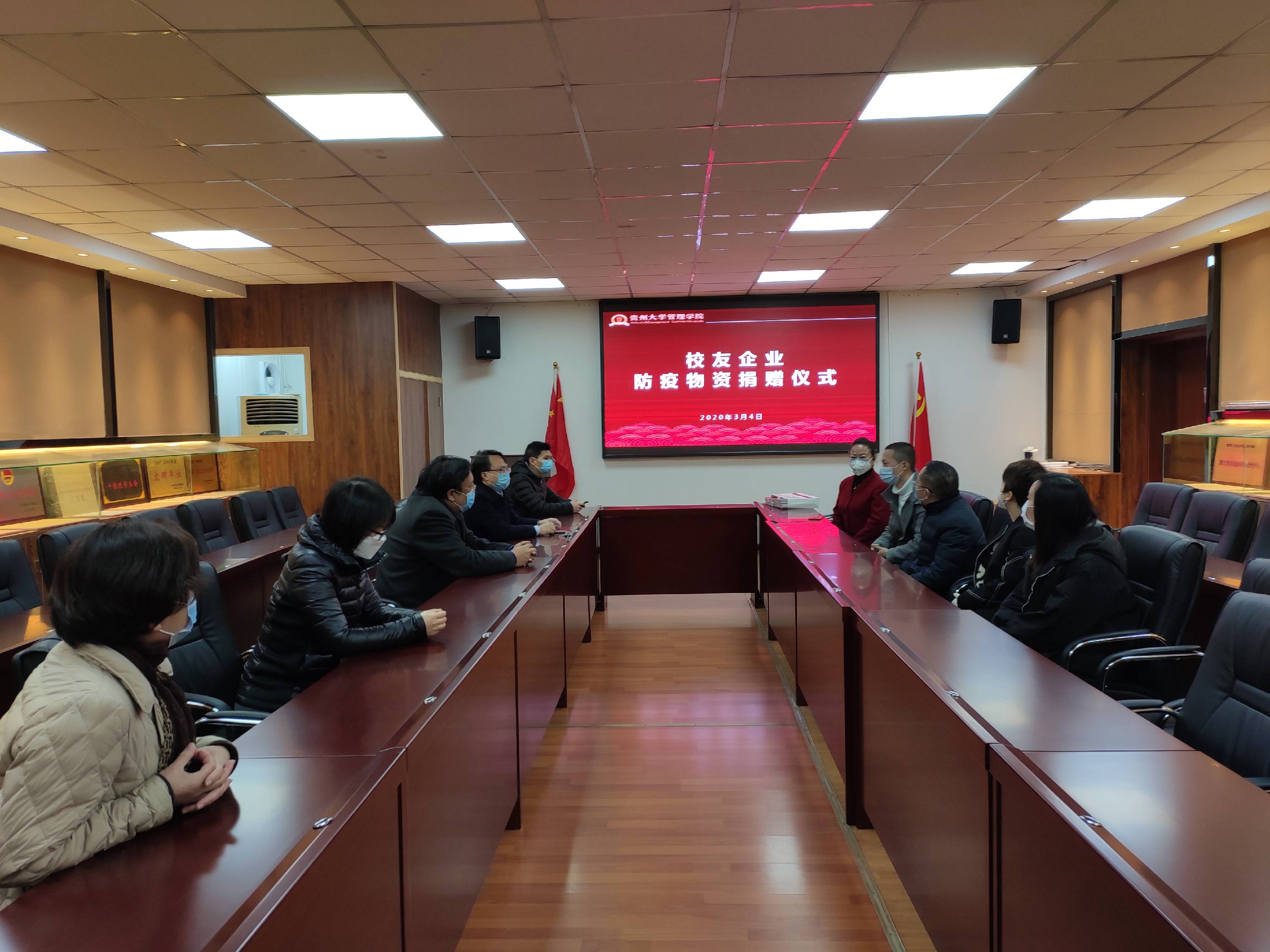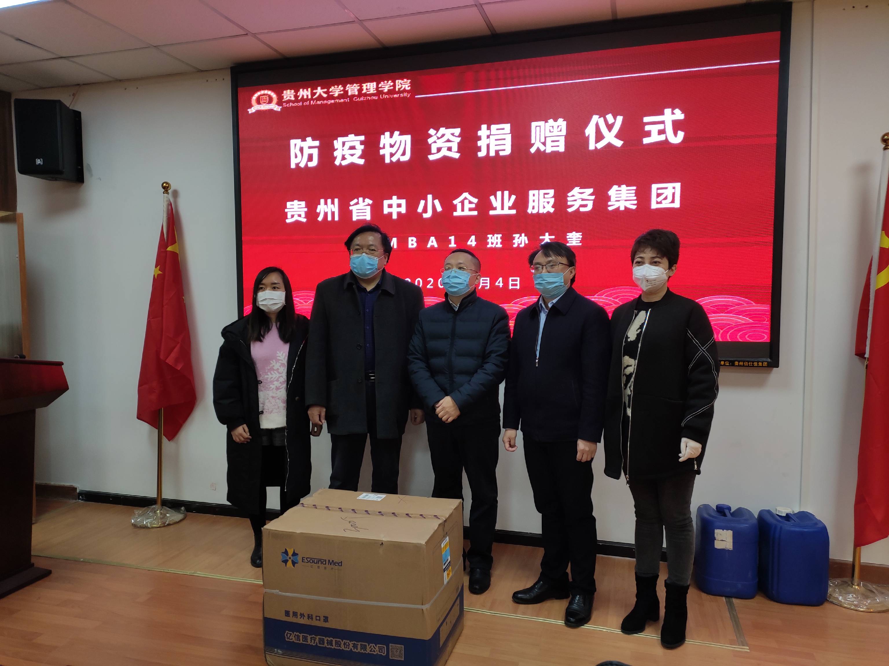 沧海横流,方显英雄本色。困难当前,方显责任担当。疫情发生以来,社会各界都在防控疫情、复工复产复教方面积极贡献力量。3月4日上午10:30,一场暖心的捐赠仪式在乐动官方网站陈列室举行。为在疫情防控物资紧缺的关键时刻,助力贵州大学“停课不停教、停课不停学”,经乐动官方网站联系对接,乐动官方网站校友企业贵州省中小企业服务集团捐赠口罩3000只,贵州金辉煌化工有限公司捐赠84消毒液1吨。乐动官方网站党委书记王秀峰,院长李烨,副院长王婷、宋山梅,办公室主任陈健,对外合作办公室主任王云,EMBA14期班贵州中小企业集团董事总经理孙大奎及办公室人员,MBA0708班贵州金辉煌化工有限公司总经理田源、EDP八班陈金筑出席了捐赠仪式,宋山梅副院长主持捐赠仪式。