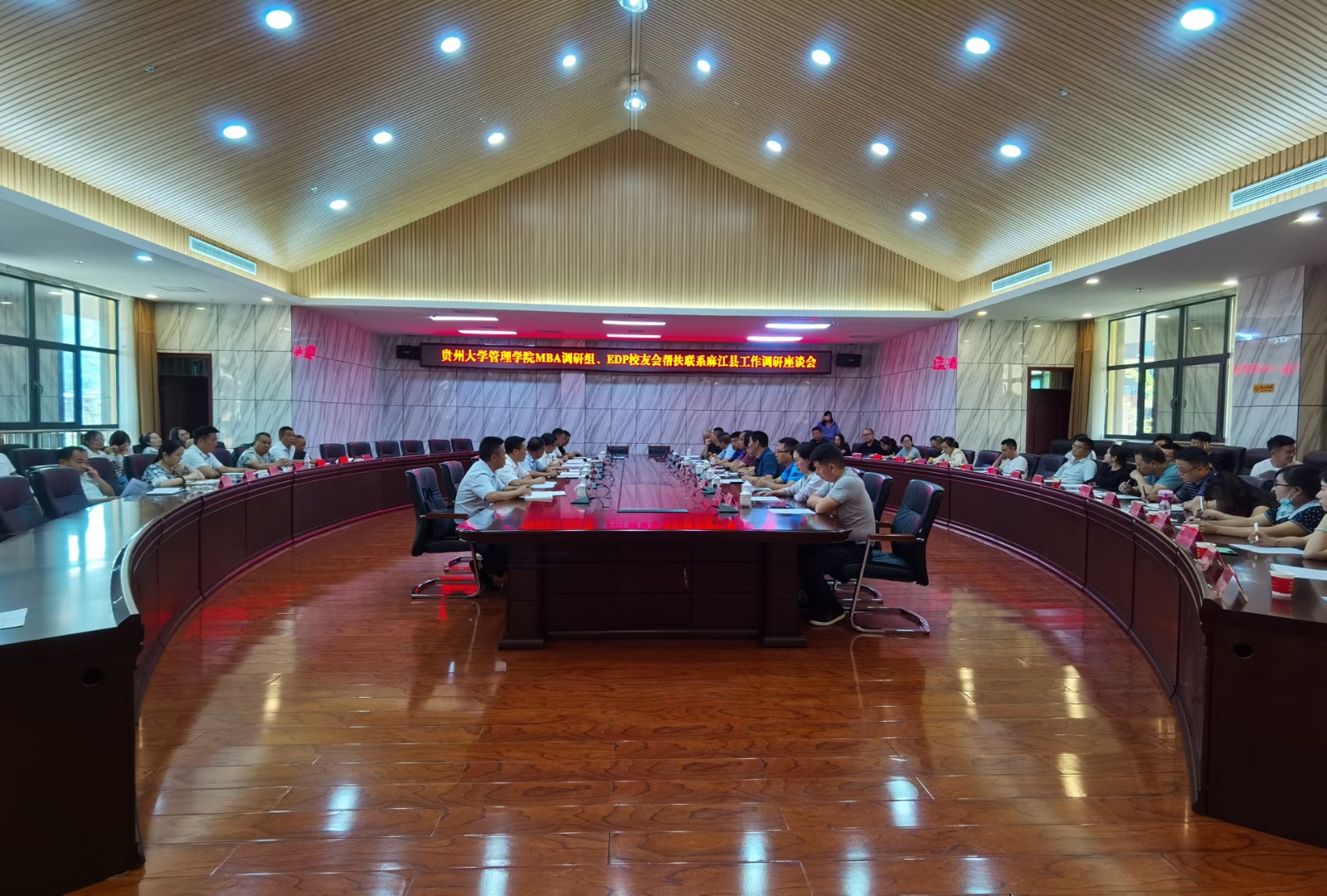 座谈会围绕麻江县乡村产业振兴及农产品营销等问题展开。麻江县就脱贫攻坚定点帮扶、地理区位优势、特色产业品牌、文化底蕴等情况向调研组进行介绍。调研组就麻江县列为贵州大学MBA教学实践基地、“麻江县农特产品营销计划”专题调研等情况进行介绍。