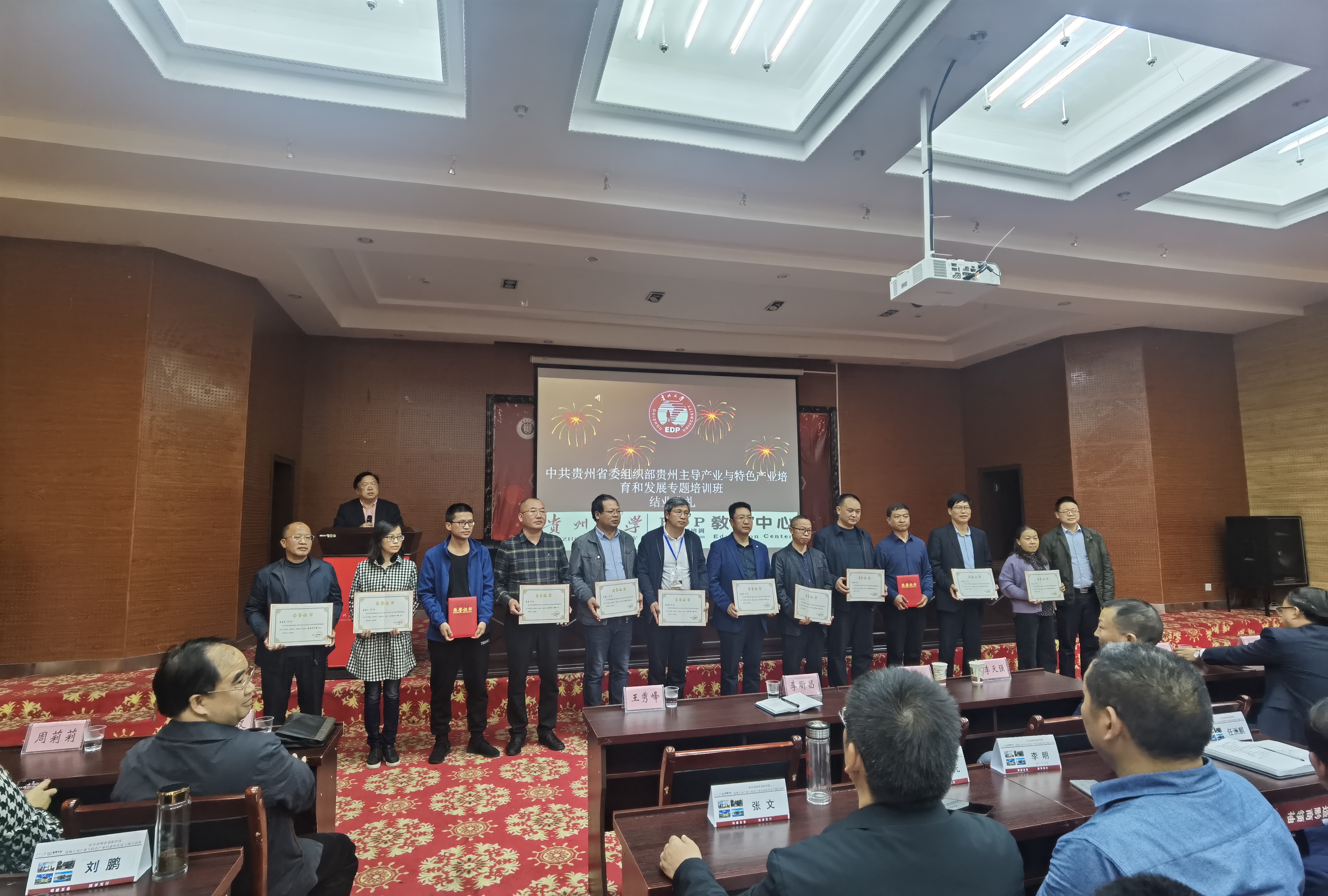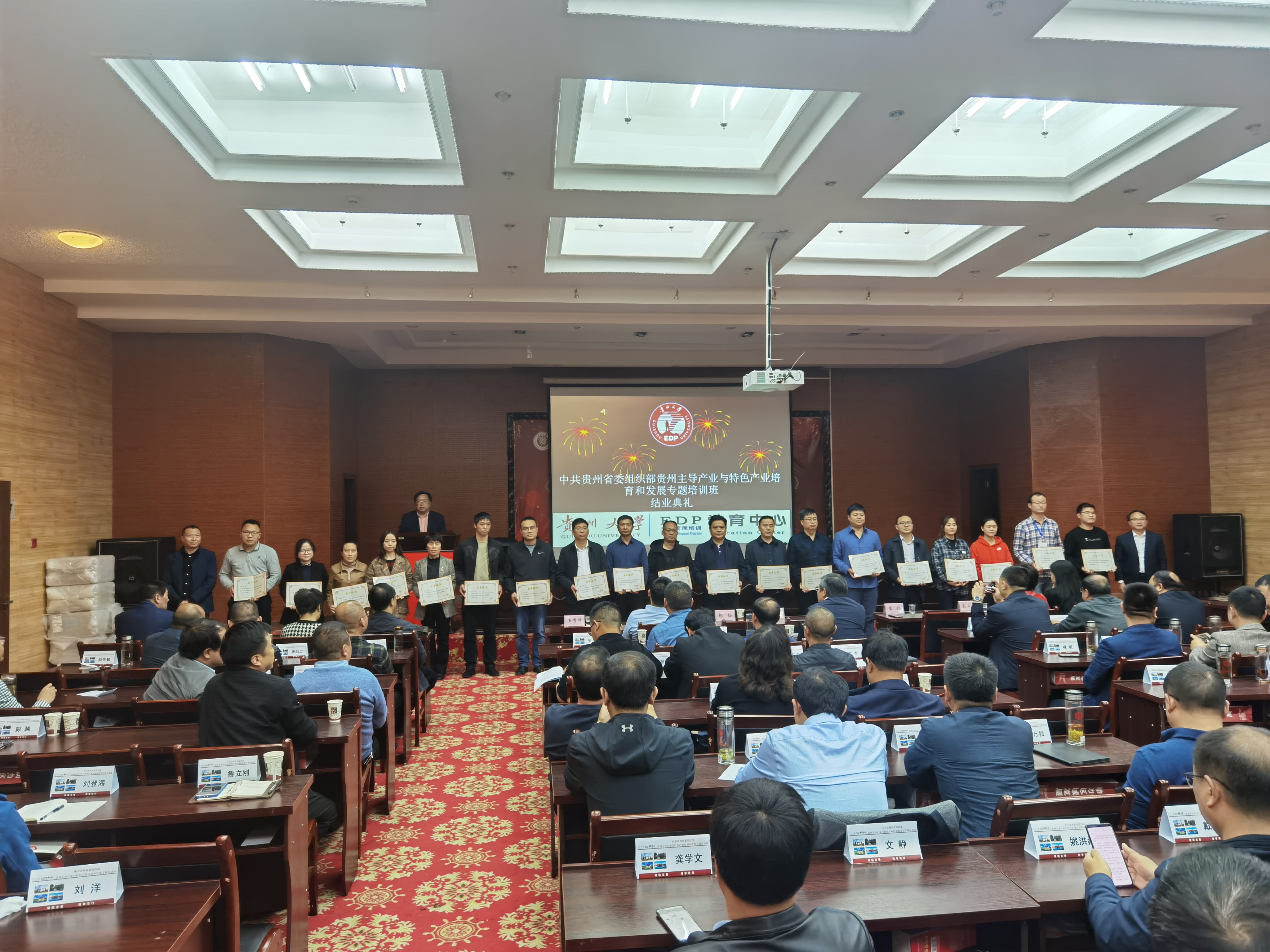 2020年11月20日,中共贵州省委组织部与我院联合举办的《贵州主导产业与特色产业培育和发展培训班》一期班结业典礼在贵州大学北校区双馨园五楼会议室举行,贵州大学杨松副校长、贵州大学组织部李昕昌部长、贵州大学宣传部李天强副部长、乐动官方网站王秀峰书记、管理学院李烨院长、管理学院宋山梅副院长、管理学院周莉莉副院长、管理学院罗敏副院长、管理学院洪影秋副书记、贵州大学EDP教育中心张勇主任出席了结业典礼。