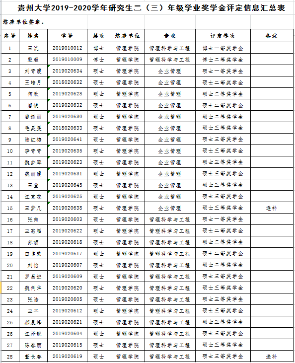 贵州大学2019-2020学年研究生二(三)年级学业奖学金评定信息汇总表