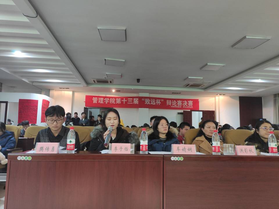 为建设我院优良学风,丰富同学们的课外活动。在历时了四个星期,进行了七场初赛,四场复赛,两场半决赛之后,管理学院辩论队于12月4日19:00在学院三楼报告厅举行“致远杯”辩论赛决赛。本次辩论赛的评委为我院党委副书记洪影秋老师、团委负责人陈芊羽老师、学生会秘书长车婧娴老师、学生科辅导员向珂莹老师、陈黔江老师以及校辩论队的樊传勇、李子怡。本次赛事由辩论队董亦菲担任主持人。
