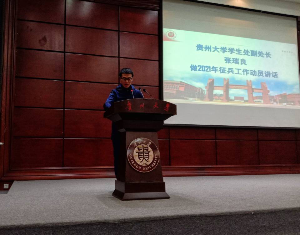 大会在庄严肃穆的国歌声中开始。首先,由贵州大学学生处副处长张瑞良做2021年征兵动员讲话。他着重从为什么去应征入伍、去部队可以享受什么优惠政策、怎样去报名入伍这三个方面做了详细的介绍。