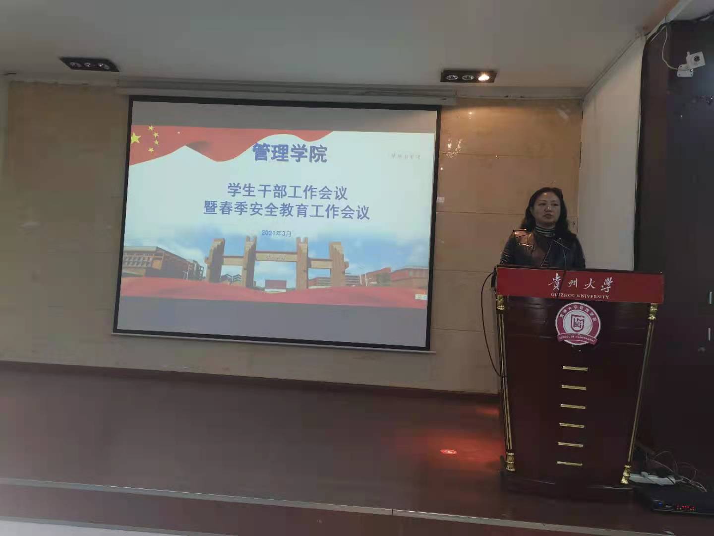 在清明假期即将到来之际,为了加强学生安全意识,提高我院班级和学生组织的工作能。2021年3月29日中午13:00,管理学院在三楼报告厅召开学生干部工作会议暨春季安全教育工作会议。出席本次会议的老师有院党委副书记洪影秋老师、学生科科长芮丽华老师、团委负责人陈芊羽老师、学生科辅导员向珂莹老师、车婧娴老师、陈黔江老师以及各班级、各学生组织的学生干部。会议由芮丽华老师主持。