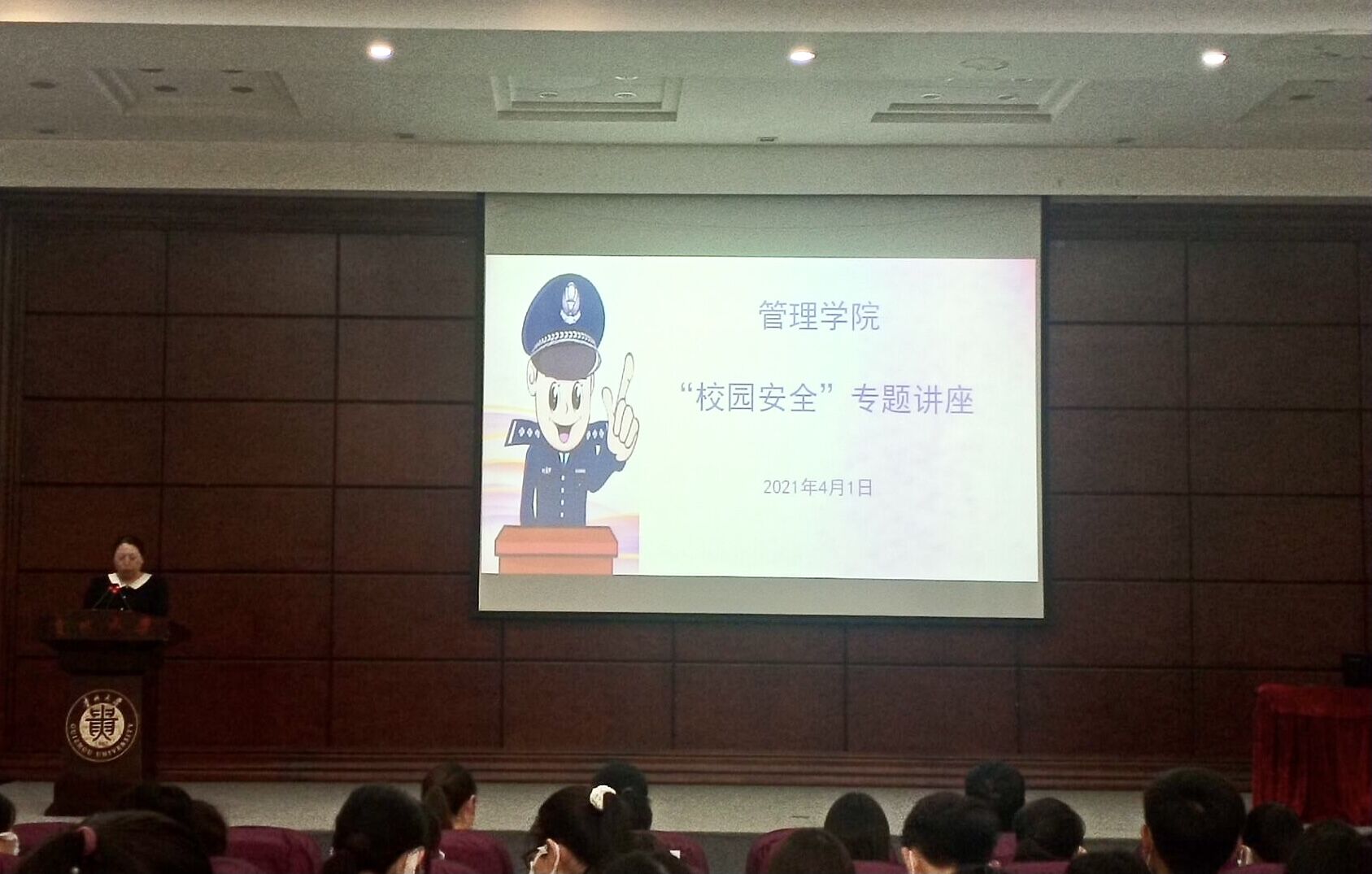 为进一步普及安全知识、强化同学们的安全意识,建设平安和谐的校园环境, 2021年4月1日16:30管理学院在贵州大学东校区行政楼报告厅开展了“校园安全”专题讲座。