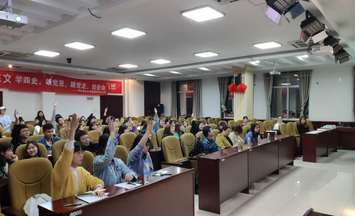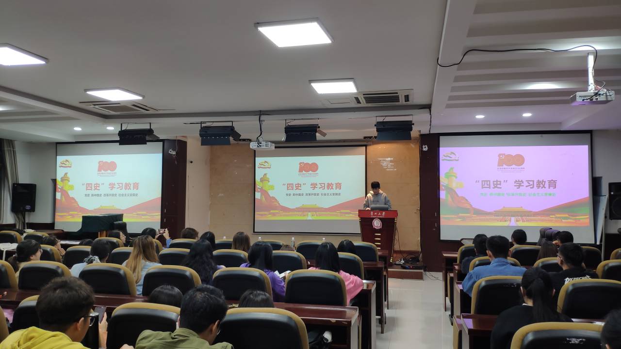 2021年4月21日19:00,“学党史、颂党恩、跟党走、践使命”——庆祝建党100周年“四史”知识竞赛在管理学院三楼报告厅举行。管理学院本科生党总支书记芮丽华、第一党支部书记陈芊羽、第二党支部书记向珂莹、第三党支部书记车婧娴、党总支委员陈黔江出席了本次比赛。全体本科生党员参加了本次知识竞赛。
