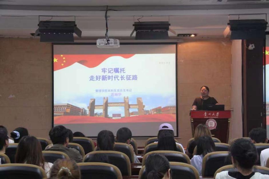 以史为镜,照盛世之机遇,华表千年,寻复兴之坦途,牢记嘱托,踏时代新长征。为了引导广大党员深入学习党史,了解在习近平总书记领导下的贵州发展史,6月22日下午,管理学院党史理论宣讲团成员,本科生党总支书记芮丽华在致远楼三楼报告厅做题为“牢记嘱托,走好新时代长征路”党史理论宣讲。学院全体研究生党员、本科生党员100余人聆听宣讲。