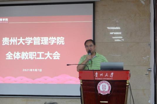 会上,院党委书记王秀峰传达了习近平总书记“七一”重要讲话精神,省委副书记、省长李炳军在贵州大学调研指示精神,以及贵州大学2021年秋季学期开学工作会暨高质量发展工作推进会议精神,并就上学期工作作简要总结、研究部署新学期相关工作。他指出,学习贯彻党的重要理论精神,是当前和今后时期的重大政治任务,我们要切实提高政治站位,做到在工作中自主学、自觉学、自愿学,将理论与实践相结合,高站位、高标准、高质量、高效率推进党史理论学习教育各项任务落到实处、细处、深处。他强调,贵州大学作为贵州一流高校,师生作为贵州区域乡村振兴工作先锋队队员,管理学院作为管理型人才培养基地,要充分扎根贵州大地、利用专业优势,在科教文卫和农林牧渔中主动建言献策,发挥示范引领作用,勇担贵州人民生活水平日益提高的助推器责任。他希望,全院教职工能再接再厉,在新学期继续将学科和产业深度融合,给产业镀金,将学科落实,把乡村振兴事业牢记在心,真正为学校“部省”合建和双一流建设添砖加瓦,为开创百姓富生态美多彩贵州新未来注入源源不断的动力。