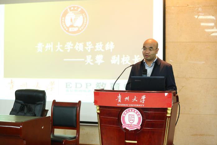 贵州大学副校长吴攀,贵州省委组织部党员教育中心教育处处长高峰,贵州大学党委组织部副部长张瑞良,贵州大学对外合作处副处长、贵州大学教育培训管理工作专班负责人付芳,乐动官方网站党委书记王秀峰,乐动官方网站院长李烨,乐动官方网站副院长宋山梅,贵州大学EDP教育中心主任张勇出席本次培训开班式。