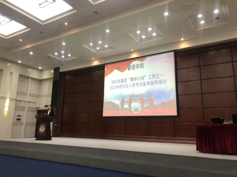 为推动学院“博学计划”工作顺利开展,帮助考研学生暑期高效备考,6月1日中午,管理学院在东校区1号行政楼报告厅举行2023年研究生入学考试备考指导培训会,邀请华图教育负责人朱小曼老师,周佳胜老师一行人来做培训指导。我院党委副书记洪影秋出席,辅导员陈黔江、向珂莹,车婧娴和2019级学生参加培训会。培训会由党委副书记洪影秋主持。