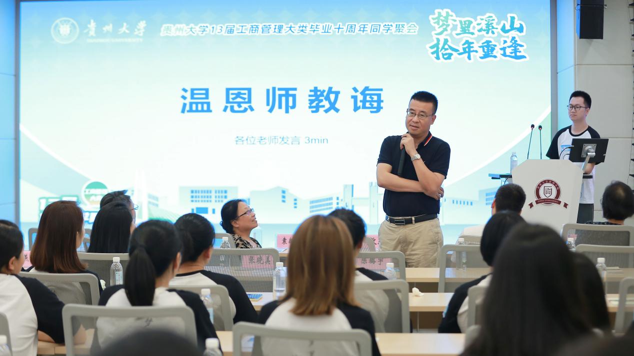李烨院长代表学院热烈欢迎大家重回母校,他说,大家从全国各地赶来,毕业十年相会聚首,体现了大家对母校的深厚情感。他向校友们简要介绍了学校奋进行动和学院发展情况。希望各位校友珍惜今日难得的相逢时光,与同窗好友再叙当年奋斗时光、与授业恩师讲讲生活近况;希望各位校友能够充分发挥中间桥梁作用,放眼长远继续携手与学院共赴卓越征程,共谋创新发展。祝福和勉励校友们立足自身实际,安顿好生活与工作,努力做出一番事业。贵大管院永远是各位校友人生旅途上的港湾,欢迎大家常回管院歇歇脚、充充电,再出发。