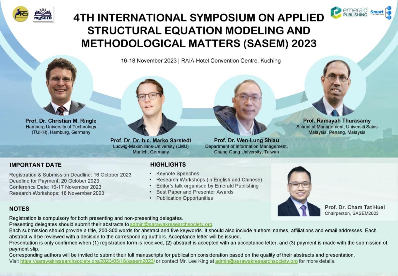 20231116日至18日,乐动官方网站汤美润副教授赴马来西亚古晋RAIA酒店会议中心参加了第四届国际应用结构方程模型和方法论研讨会(SASEM 2023)。来自全球的学者和专家聚集一堂,共同探讨定量方法在管理学研究中的进步和应用。会议邀请了多位知名学者进行主题演讲,包括来自德国汉堡工业大学(Hamburg University of Technology)的Christian M. Ringle教授和慕尼黑大学(Ludwig-Maximilians University)Marko Sarstedt教授,以及来自台湾长庚大学(Chang Gung Univerisity)Wen-Lung Shiau教授和马来西亚理科大学(Universiti Sains Malaysia)的Ramayah Thurasamy教授。