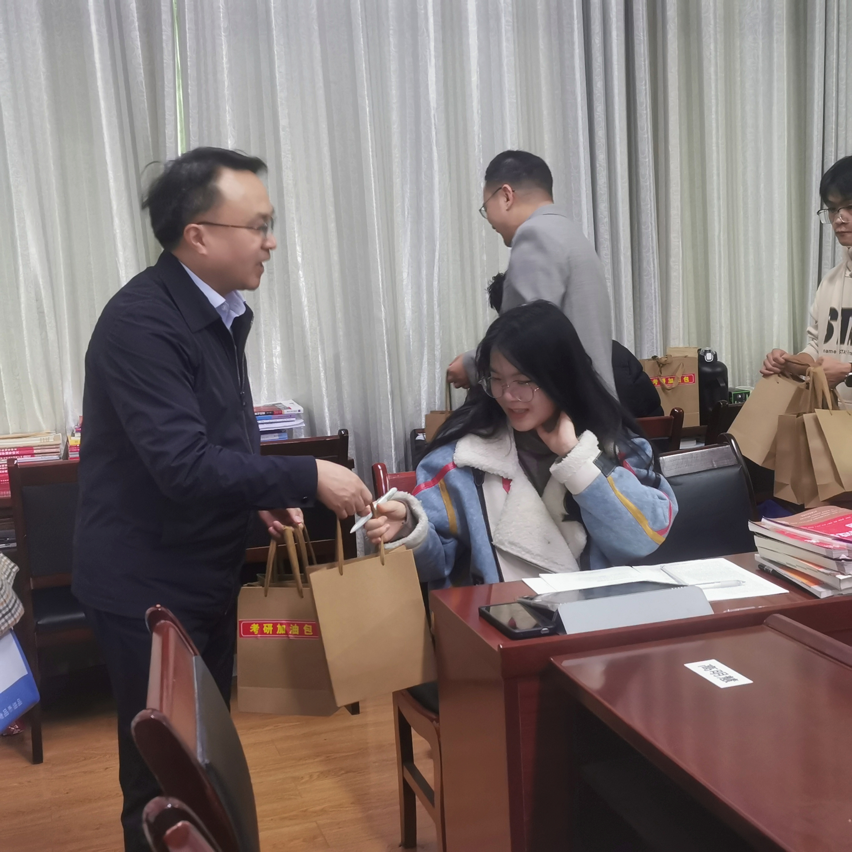 2024年全国硕士研究生招生考试进入最后倒计时,为陪伴考研学子共同度过这一重要阶段,学院安排了院领导、系主任、辅导员、班主任、副班主任等值班,为考研学子加油鼓劲的同时。于12月12日中午,管理学院特举办考研慰问活动,为即将参加考试的同学们送去关心和祝福。此次活动由贵州大学党委常委、副校长赵留彦教授,携管理学院领导班子及辅导员作为代表,共同前往学院考研自习室为同学们送上暖心加油包,激励他们全力以赴、笃志前行,跑赢考研这场“马拉松”。