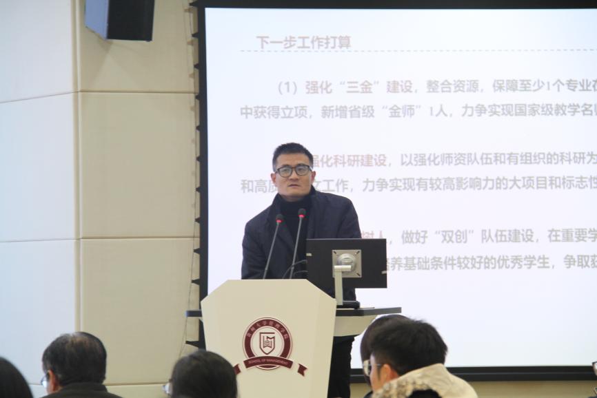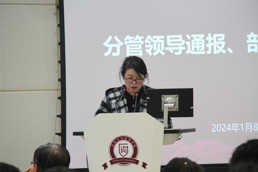 李烨院长通报总结2023年度管理学院推进的主要工作和取得的成效,表扬并肯定全体教职工2023年度的工作成果,同时也指出部分不足之处,鼓励学院全体教职工继续奋斗,在新的一年里再接再厉,有所突破。