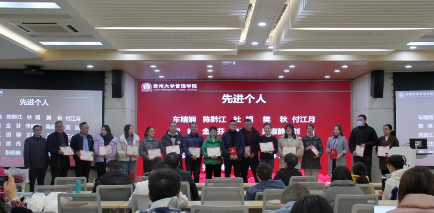 随后,学院对2023年度管理学院“先进个人”“先进部门(集体)”进行表彰,学院领导为获表彰的集体和个人颁发荣誉证书。共计表彰“先进个人”48人,“先进部门(集体)”6个。李烨院长对获得表彰的个人和集体表示祝贺,并勉励大家在2024年接续奋斗,再创佳绩。