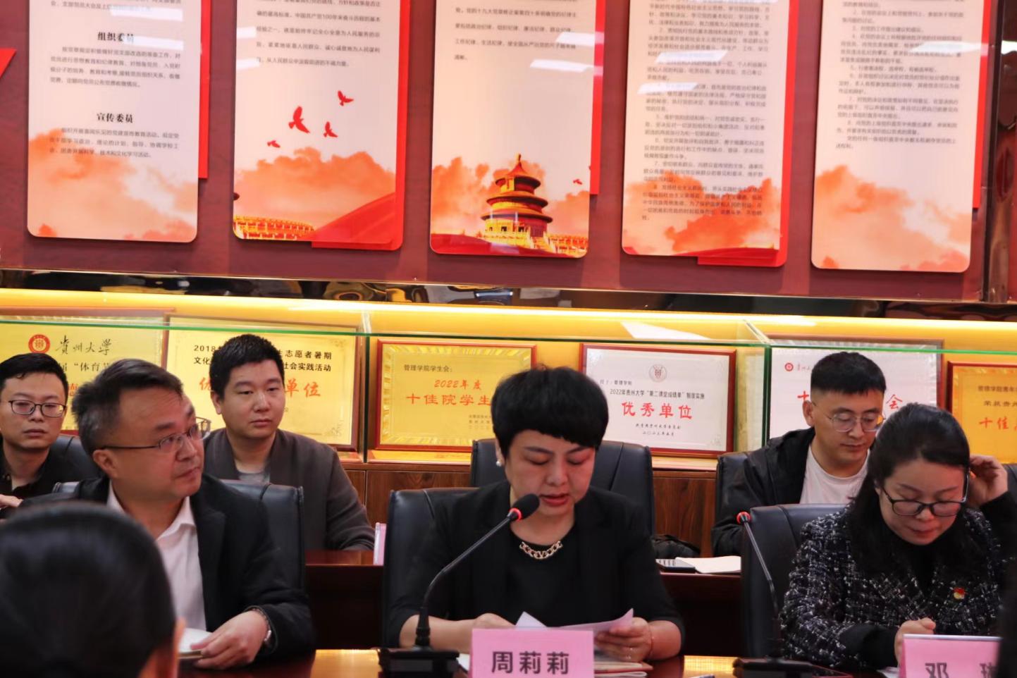 首先,贵州大学党委正处级组织员、管理学院党委副书记(主持党委工作)周莉莉同志作动员讲话。她指出,本次党纪学习教育的主要任务是深入学习领会习近平总书记关于加强党的纪律建设的重要论述,集中学习《中国共产党纪律处分条例》,广大党员干部要学会敬畏党,坚定拥护“两个确立”,坚决做到“两个维护”;要学会敬畏人民,始终保持党和人民群众的血肉联系;要学会敬畏法纪,为推进学校双一流建设、立德树人、高质量发展提供坚实的政治保证。