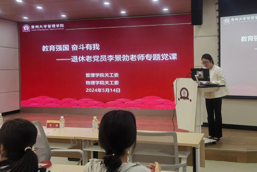 2024514日中午13点,管理学院关工委、物理学院关工委“读懂中国”系列活动在管理学院三楼报告厅开展,特邀学校关工委副秘书长、联系学院退休老党员李景勃老师以“教育强国,奋斗有我”为主题给两个学院学生上专题党课,并作“关工委话成长”交流座谈,管理学院党委副书记邓琳主持,物理学院副处级组织员王颖红、两院师生代表120余人参加。