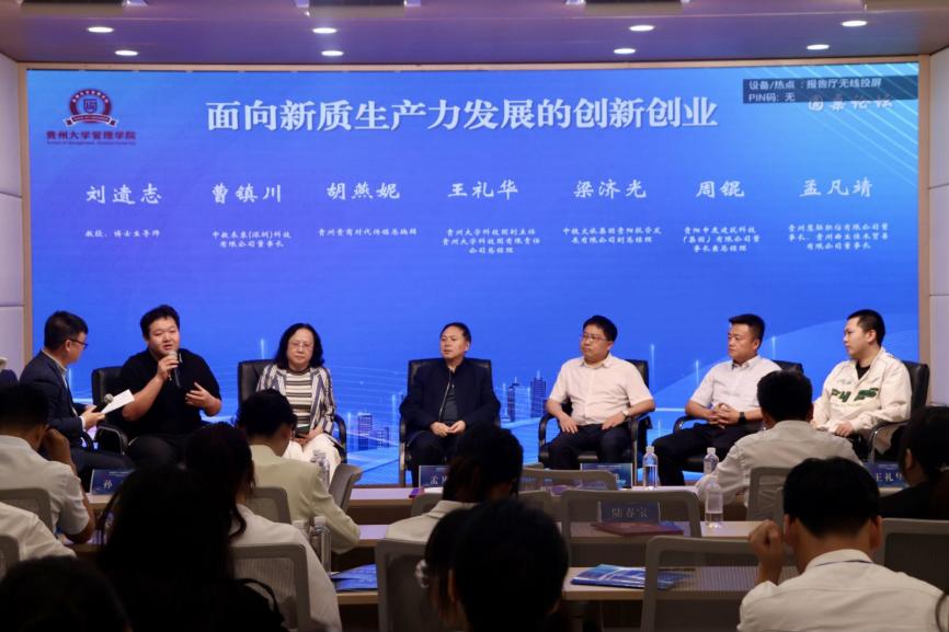第三项议程是双创导师进行圆桌讨论。出席本次讨论会的嘉宾有中教未来(深圳)科技有限公司董事长曹镇川先生、贵州贵商时代传媒总编辑胡燕妮女士、贵州大学科技园副主任(贵州大学科技园有限责任公司总经理)王礼华先生、中铁文旅集团贵阳投资发展有限公司副总经理梁济光先生、贵阳中度建筑科技(集团)有限公司董事长兼总经理周锟先生以及贵州慧联职信有限公司董事长(贵州曲生佳木贸易有限公司董事长)孟凡靖先生,论坛由刘遗志教授主持。