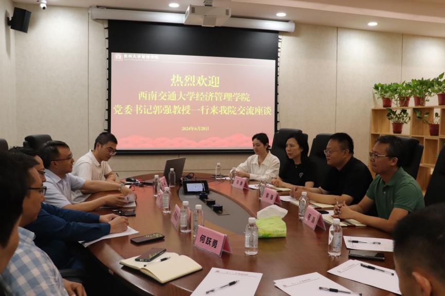 2024年6月28日,西南交通大学经济管理学院党委书记郭强教授及其团队成员来我院调研交流。管理学院院长李烨教授及相关部门负责人参与座谈。此次座谈旨在分享管理经验,探讨合作形式,共同推动两院管理学科的进一步发展。