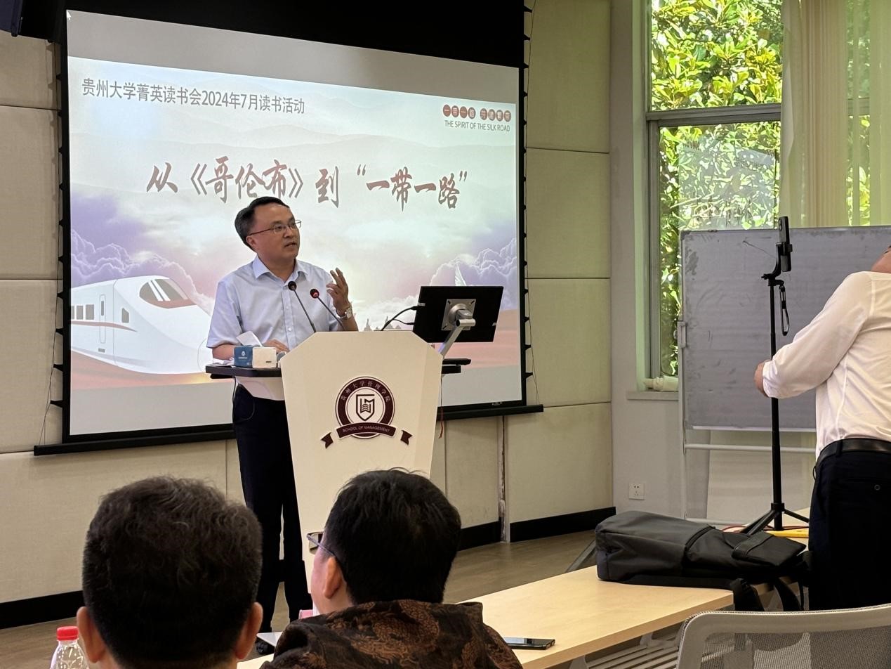 2024年7月6日,贵州大学管理学(EMBA&MBA&EDP)菁英读书会在管理学院三楼报告厅举办了主题为从《哥伦布》到“一带一路”的读书活动。本期读书由EMBA校友罗纲举(贵阳方舟科技有限公司总经理、读书会荣誉会长)分享。活动以现场分享、互动提问的方式让来自读书会和学院在读的MBA约40多名校友、同学参与到本次活动当中。贵州大学党委委员、乐动官方网站院长李烨出席了活动。活动主持人为读书会会长吴迪、读书会联合会长陈隽宁。