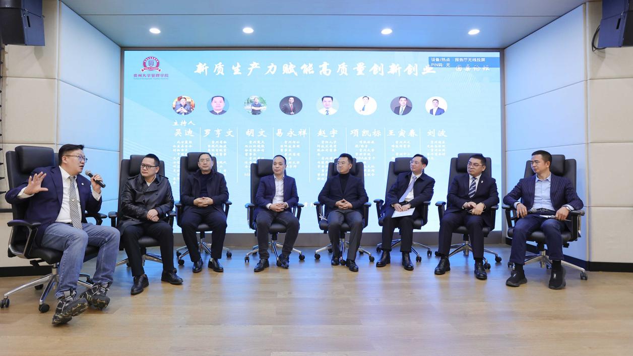 仪式第七项,贵州大学MBA企业家成长营导师圆桌论坛“新质生产力赋能高质量创新创业”,参加此次圆桌论坛的导师有:贵州省物资现代物流集团有限责任公司董事长罗亨文、贵州楚天两江环境股份有限公司董事长胡文、贵州佰仕佳科技集团董事长易永祥、中国国际文化交流中心能源经济研究院国际交流部主任、北京蓝图公益基金会副秘书长吴迪、贵阳九宇科技发展有限公司董事长赵宇、贵州循美文旅产业有限公司董事长刘波以及MBA教育中心主任项凯标教授。各位嘉宾就新质生产力内涵、科技创新战略布局、创新人才、科创平台、成果转化等关键领域进行深入探讨,交流改革创新经验,探索未来发展路径。互动交流环节,学员及导师结合贵州实际,从不同视角阐述了科技创新如何更好地赋能贵州新质生产力,对贵州推进高质量发展提出了一系列宝贵建议。最后大家一致认为,新质生产力赋能高质量创新创业需要技术创新引领、人才智力支撑、资金持续投入、政策有力保障以及良好创新生态协同推进。
