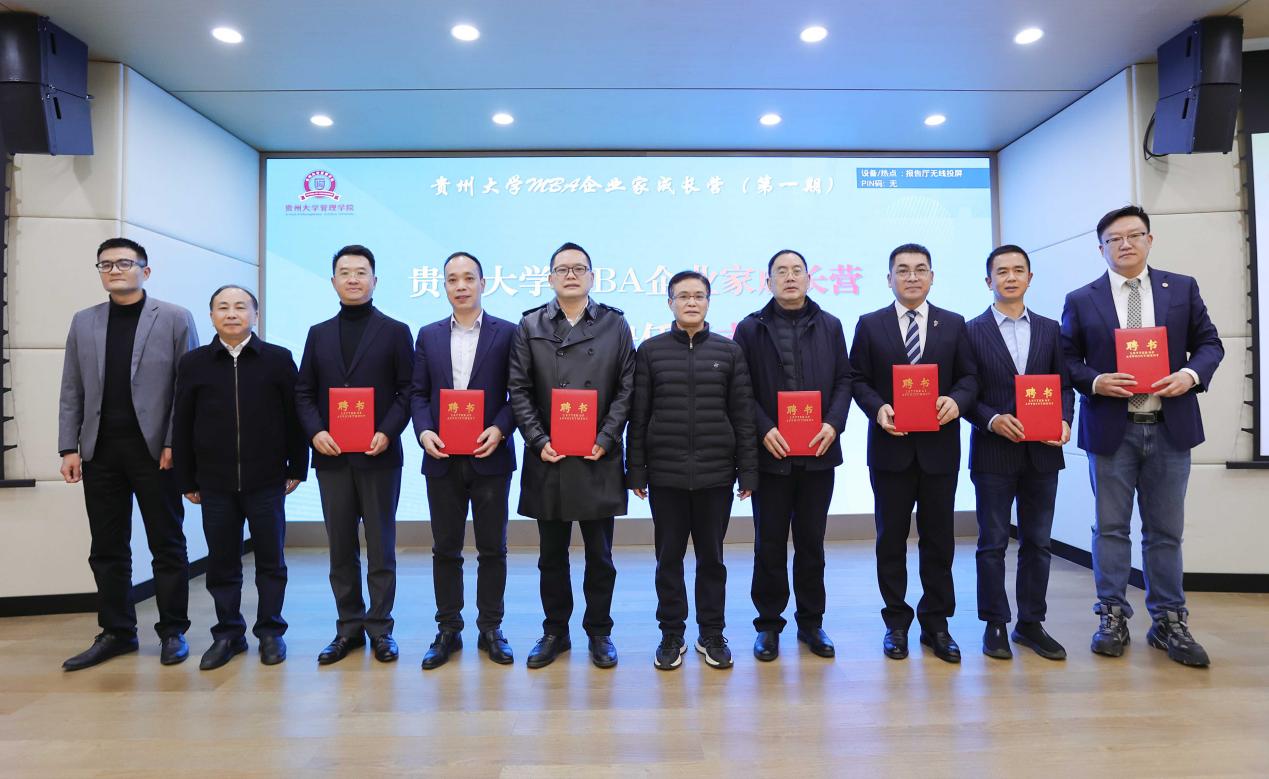 仪式第四项,贵州大学党委正处级组织员、管理学院党委委员李开学教授,管理学院副院长李本光教授,管理学院副院长许为宾教授,为企业家成长营的导师颁发聘任证书。